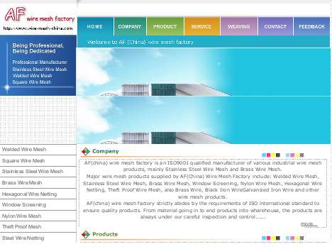 Anping County Anyang Wire Mesh is an enterprise engaged in manufacturing,producing as well as trading various kinds of iron wire and wire meshes ,and own the advanced wire-drawing,galvanizing and net-weaving equipments.Its main and major products are: stainless steel wire mesh ;soft black iron wiregalvanized iron wire;series of kinds of brass and red-copper meshes; various kinds of window screening;welded meshes; hex meshes; diamond meshes;galvanized square-hole meshes;barbed wire;crimp meshes;expressway wire neting etc.